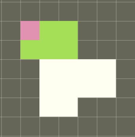 Algorithm sorts first the tiles in top-to-bottom and left-to-right order so it starts from top left tile. The pink denotes the current working tile c. The green represents the tiles that belong to rectangle as determined by call to get_rectangle_size.